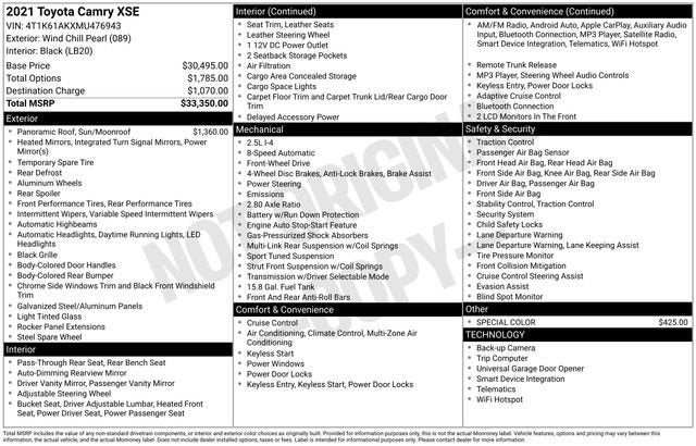 2021 Toyota Camry XSE FWD 8-Speed Automatic 2.5L I4 DOHC 16V Pearl